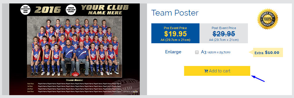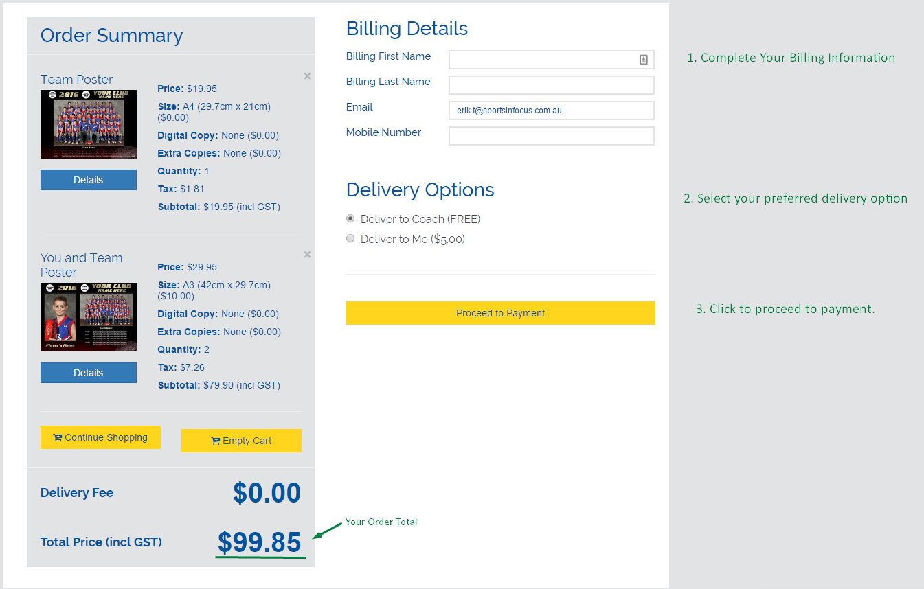 Once you have finished adding your desired posters to your cart, please double check the order details. You can check the player details again by click the Blue Details button under the poster. Once you are happy, please add your billing details, select and complete your delivery options from the available options for your event, and then click to proceed to payment.